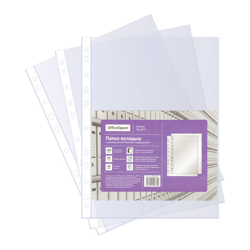 Описание: Глянцевые прозрачные файлы-вкладыши OfficeSpace формата А4 размера 305*235 мм имеют универсальную перфорацию для хранения документов формата А4 в любых папках с кольцевым механизмом и скоросшивателем. Вертикальная ориентация, толщина пленки 40 мкм, вместимость файла до 50 листов бумаги, прочные швы. В упаковке 100 штук. Глянцевая поверхность и яркий информационный вкладыш в каждой групповой упаковке