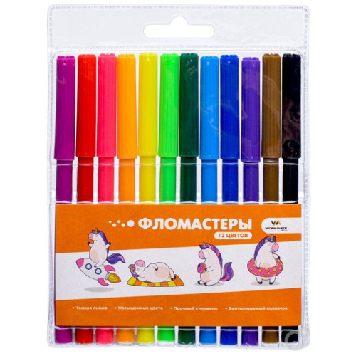 Описание: **Фломастеры Workmate** предназначены для рисования, творческих и оформительных работ на бумажной поверхности. Выполнены на водной основе, легко отмываются с одежды и рабочей поверхности стола. Вентилируемый колпачок обеспечивает безопасность при использовании фломастеров детьми. Ребристая поверхность колпачка способствует крепкому удержанию в руке, исключает скольжение при открывании фломастера. Конусовидный стержень заблокирован, сохраняет форму при сильном нажатии. Подходят для детей от 3 лет. Поставляются в пластиковой упаковке с европодвесом. В наборе 12 цветов