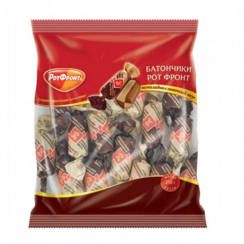 Конфеты Рот Фронт предназначены для ежедневного употребления с чаем и просто так. Конфеты с шоколадно-сливочным вкусом поставляются в индивидуальной упаковке весом 250 грамм.