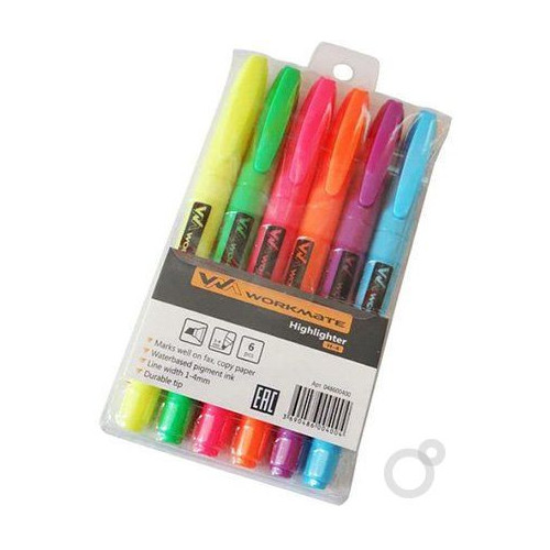 Описание: **Набор текстовых маркеров Workmate H-4** включает в себя 6 маркеров, предназначенных для выделения текста на бумаге любой плотности. Пластиковый корпус соответствует цвету чернил. Скошенный наконечник обеспечивает линии толщиной от 1 до 4 мм. Флуоресцентные чернила на водной основе быстро высыхают и не размазывают текст. В наборе цвета: желтый, зеленый, красный, оранжевый, фиолетовый, голубой. Маркеры упакованы в прозрачный PVC - пенал на кнопке и с европодвесом