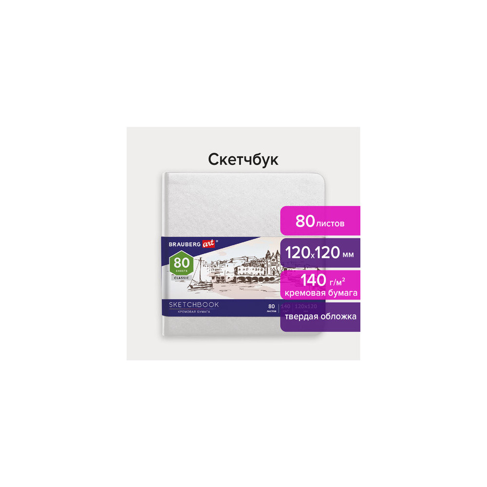 Скетчбук BRAUBERG ART "CLASSIC" подходит для эскизов, графики, набросков, каллиграфии, леттеринга, скетчинга и записей. Утонченный, компактный скетчбук с жесткой обложкой, покрытой материалом, стилизованным под гладкую кожу. Внутренний блок - 80 листов специальной художественной бумаги кремового цвета плотностью 140 г/м2. Подходит для работы с широким спектром графических материалов (ручки, карандаши, линеры и прочие). Благодаря компактному формату его можно носить с собой, а жесткая обложка станет верным подспорьем для рисования на весу. Дополнением является закладка-ляссе, с помощью которой при необходимости можно быстро открыть скетчбук на нужной странице, а эластичная резинка надежно сбережет листы от замятия и случайного раскрытия. Скетчбук станет прекрасным выбором для любителей и профессионалов, студентов и школьников, художников и дизайнеров.
