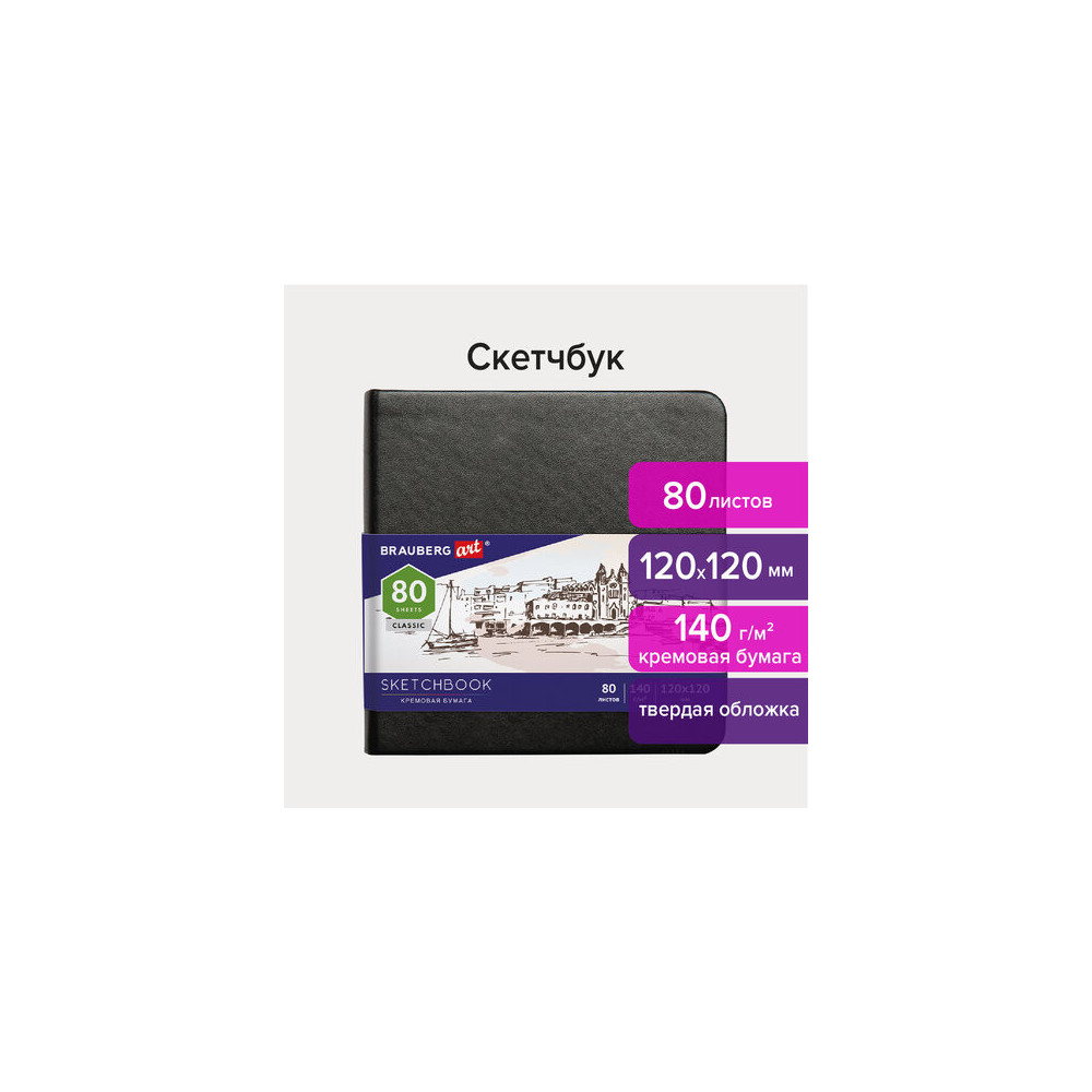Скетчбук BRAUBERG ART "CLASSIC" подходит для эскизов, графики, набросков, каллиграфии, леттеринга, скетчинга и записей. Утонченный, компактный скетчбук с жесткой обложкой, покрытой материалом, стилизованным под гладкую кожу. Внутренний блок - 80 листов специальной художественной бумаги кремового цвета плотностью 140 г/м2. Подходит для работы с широким спектром графических материалов (ручки, карандаши, линеры и прочие). Благодаря компактному формату его можно носить с собой, а жесткая обложка станет верным подспорьем для рисования на весу. Дополнением является закладка-ляссе, с помощью которой при необходимости можно быстро открыть скетчбук на нужной странице, а эластичная резинка надежно сбережет листы от замятия и случайного раскрытия. Скетчбук станет прекрасным выбором для любителей и профессионалов, студентов и школьников, художников и дизайнеров.