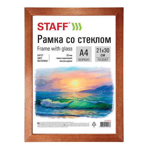 Стандартный размер А4 позволяет использовать данный предмет для широкого спектра документов. Возможность вертикального и горизонтального подвеса. Ширина багета - 20 мм. Рамка выполнена из дерева темно-коричневого цвета, за счет чего отлично впишется в домашний и деловой интерьер.