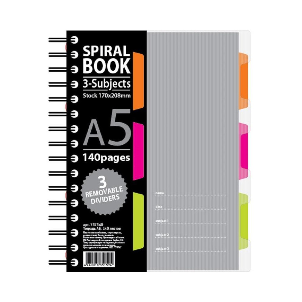 Описание: Бизнес-тетрадь Spiral Book формата А5, 140 листов. Обложка с вырубкой из жесткого экологичного прозрачного пластика с волнистым рельефом, двойная толстая евроспираль, увеличенного диаметра. Пластиковые съемные разделители. Первый лист из плотной бумаги с запечаткой, разлиновка в клетку с аккуратными полями. Серый Дизайн. Размер — 147x204 мм.